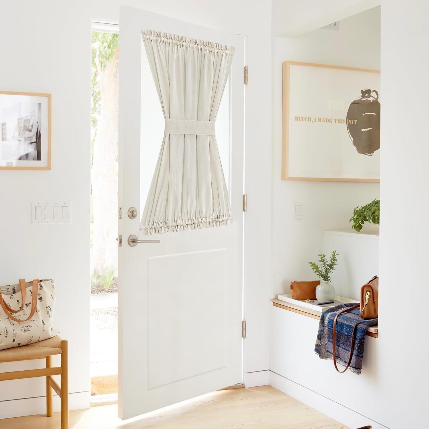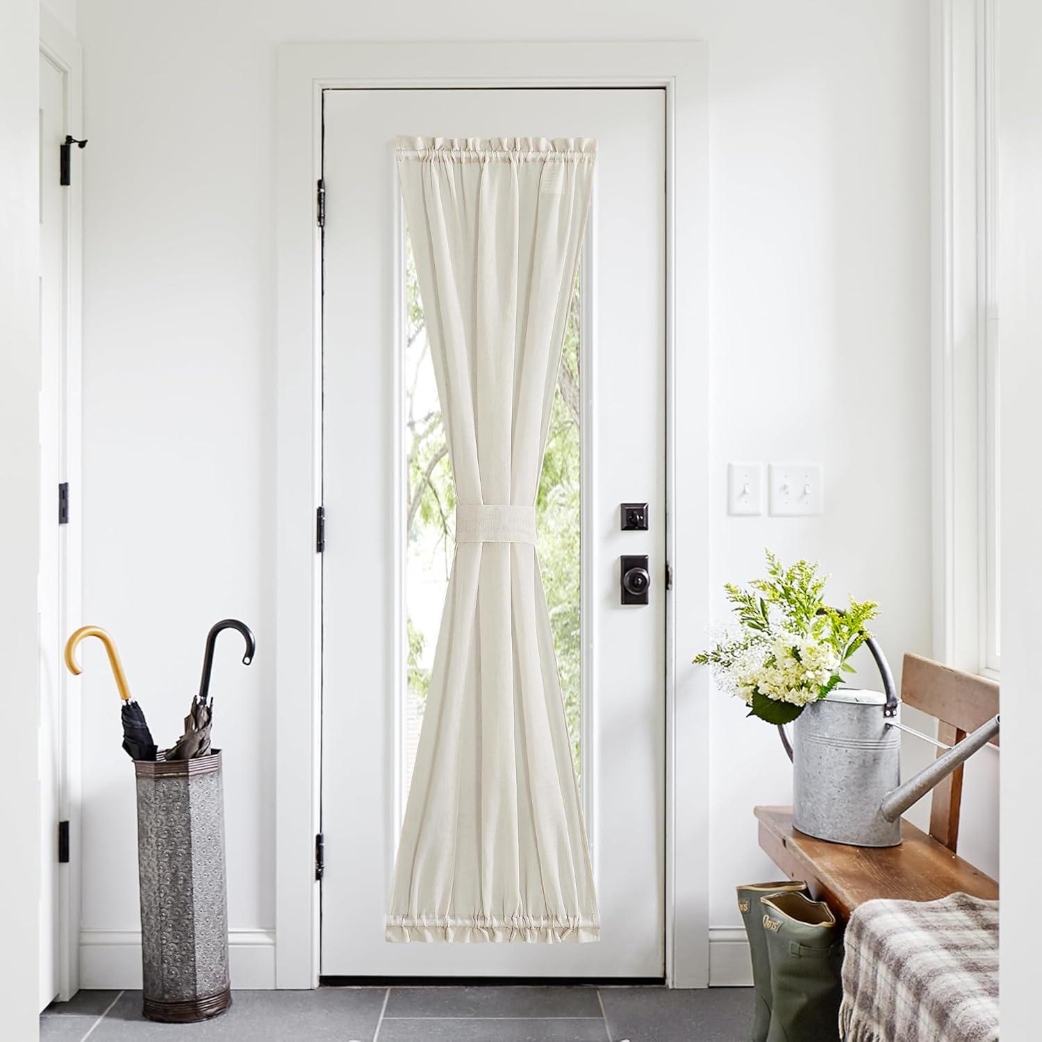 Ready Made: Each package contains 1 panel of 30″W x 40″L linen door curtain with a tie-back. These pretty linen sheer door panels feature top and bottom rod pockets for easy installation. It is ideal for a door window that brings French elegance to your room.