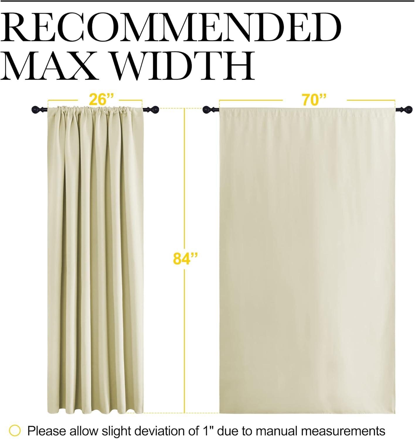 ELEGANT DESIGN: 2 panels per package. Each Blackout Curtain Panel measures 70 inches wide x 84 inches long. The NICETOWN drapery is constructed with rod pocket, fitting the curtain rod of your choice up to 2 inches in diameter, making the curtains easy to install and slide.