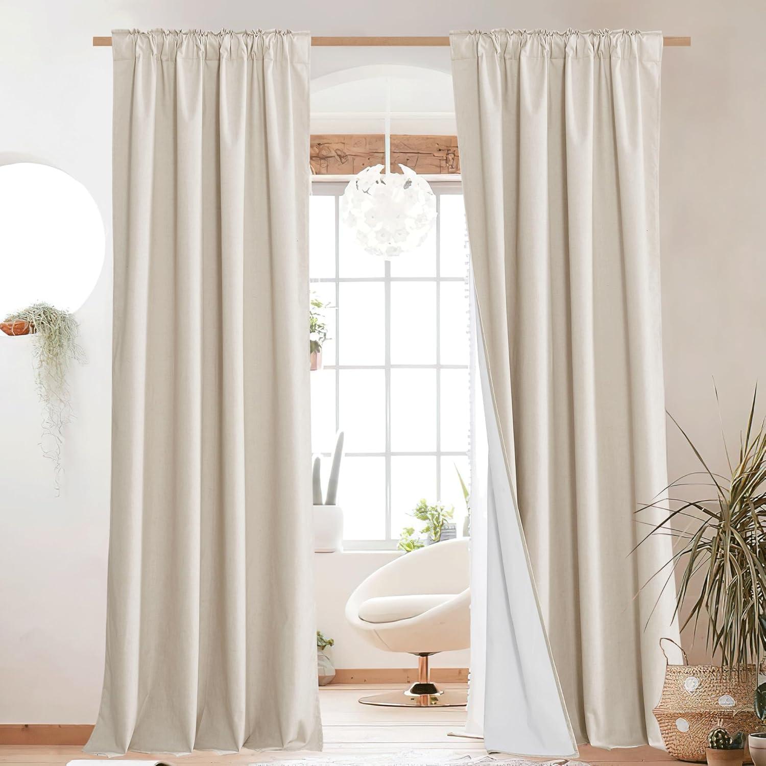 NICETOWN Natural Full Blackout Back Tab Linen Curtains 84″ Long 2 Panels, Boho-Chic Thick Linen Blend Drapes for Bedroom, Thermal Insulated Window Covers with White Backing for Cafe Bar (42″ Wide)(Beige)