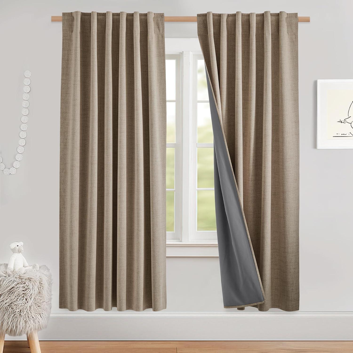 imageNICETOWN Natural Full Blackout Back Tab Linen Curtains 84 Long 2 Panels BohoChic Thick Linen Blend Drapes for Bedroom Thermal Insulated Window Covers with White Backing for Cafe Bar 42 WideBrich