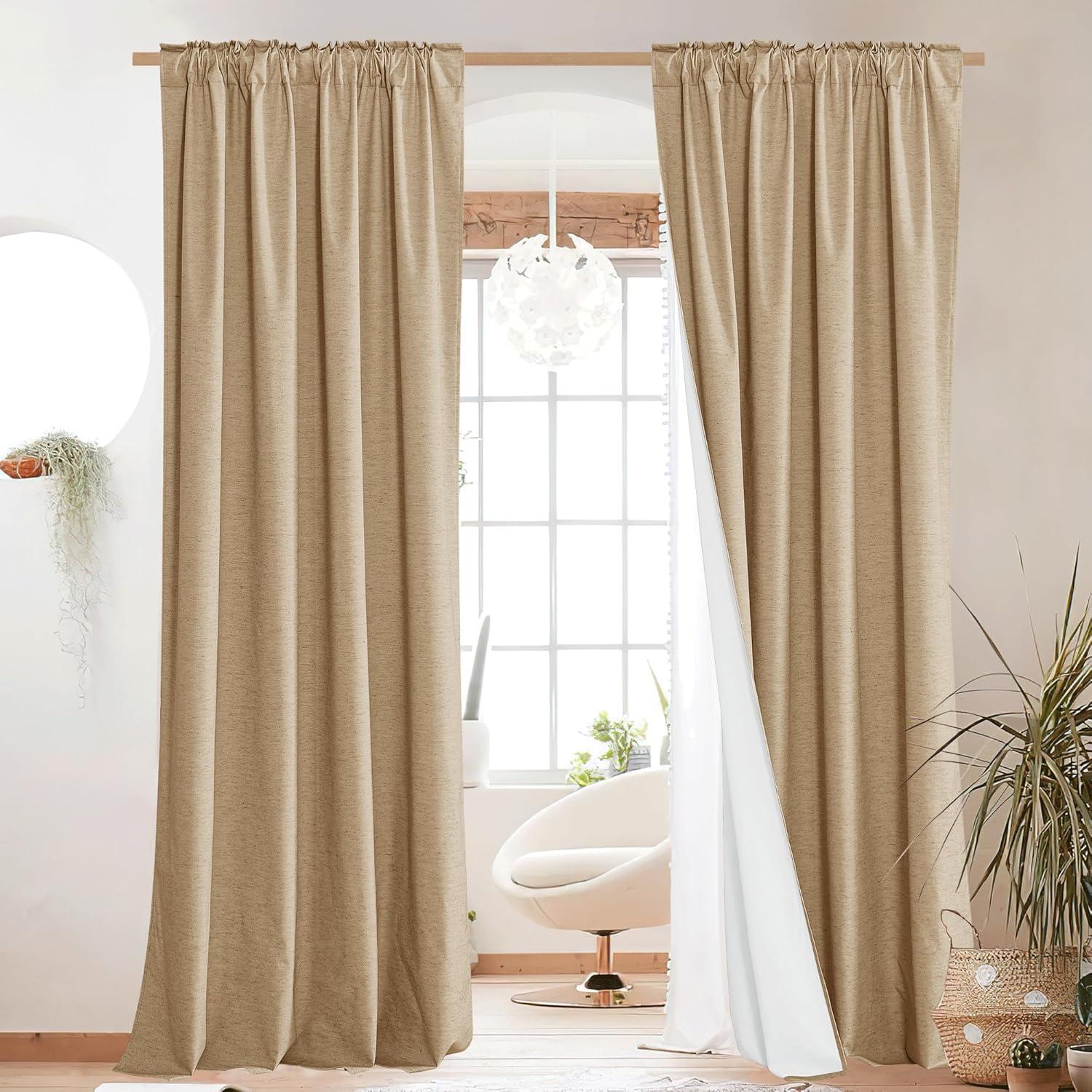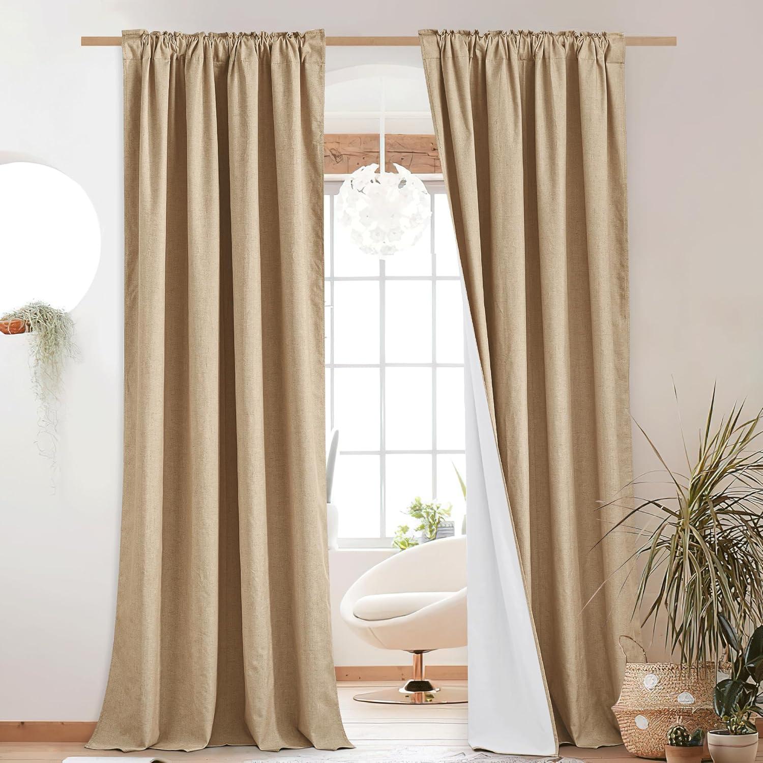 NICETOWN Natural Full Blackout Back Tab Linen Curtains 84" Long 2 Panels, Boho-Chic Thick Linen Blend Drapes for Bedroom, Thermal Insulated Window Covers with White Backing for Cafe Bar (42" Wide)(Camel)
