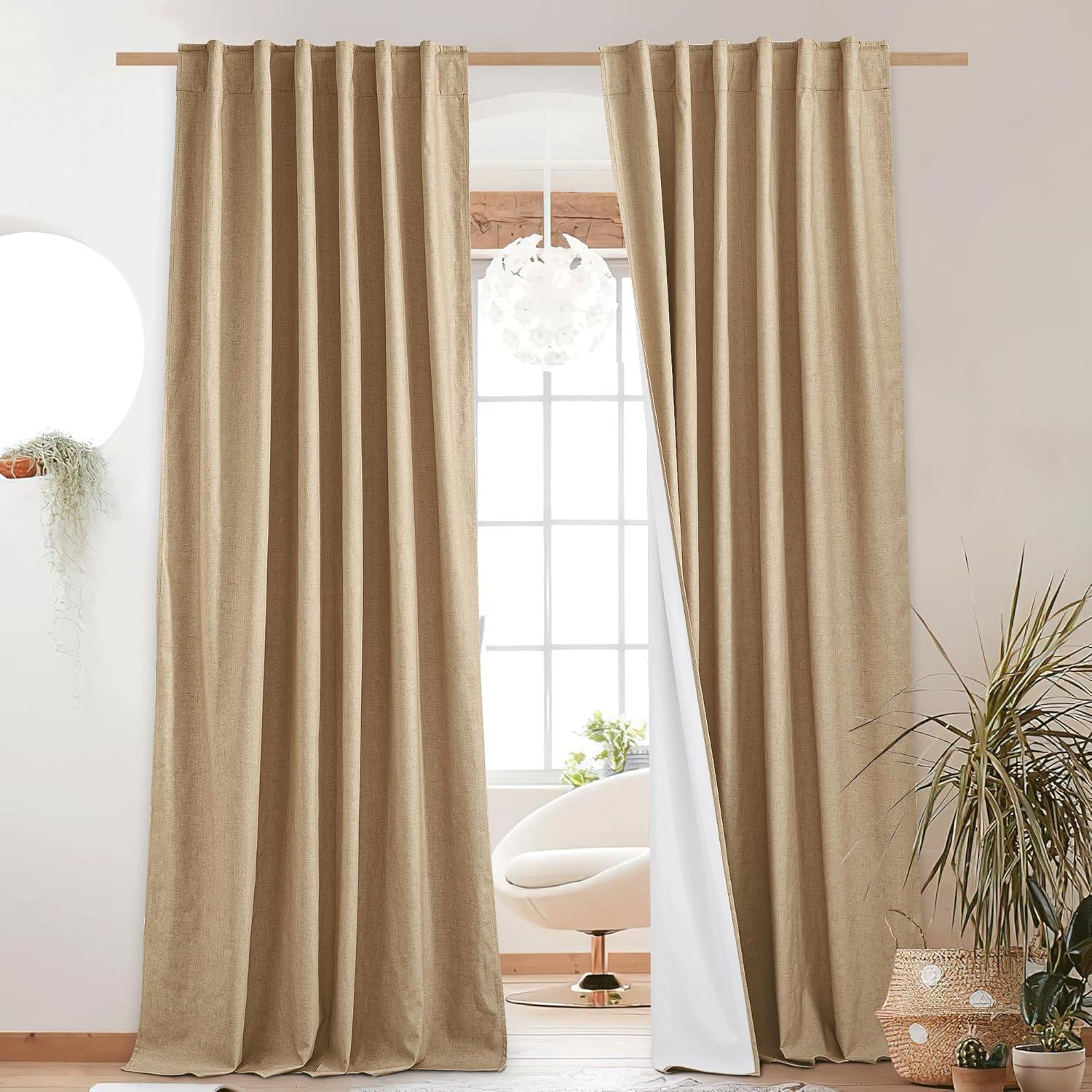 NICETOWN Natural Full Blackout Back Tab Linen Curtains 84″ Long 2 Panels, Boho-Chic Thick Linen Blend Drapes for Bedroom, Thermal Insulated Window Covers with White Backing for Cafe Bar (42″ Wide)(Camel)