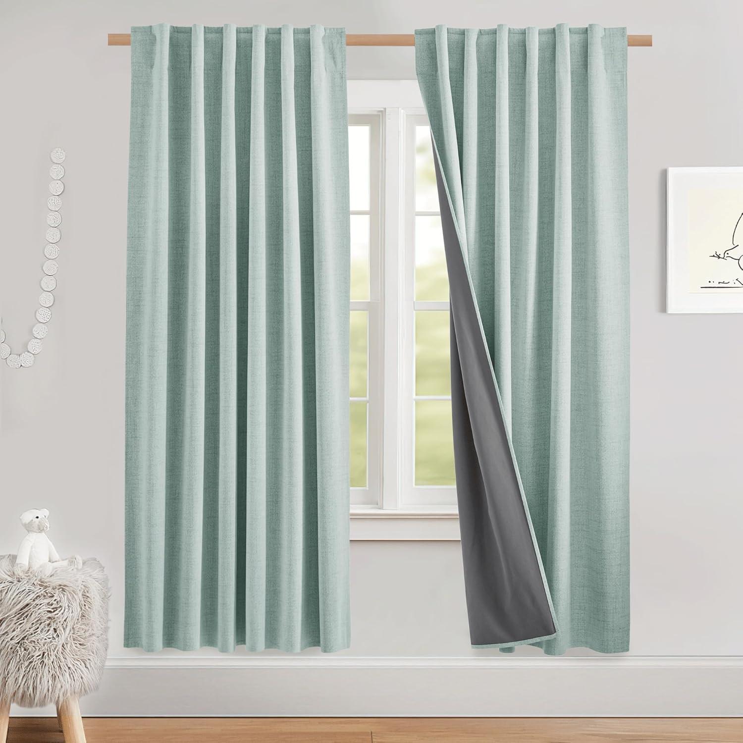 NICETOWN Natural Full Blackout Back Tab Linen Curtains 84" Long 2 Panels, Boho-Chic Thick Linen Blend Drapes for Bedroom, Thermal Insulated Window Covers with White Backing for Cafe Bar (42" Wide)(Seafoam Green)