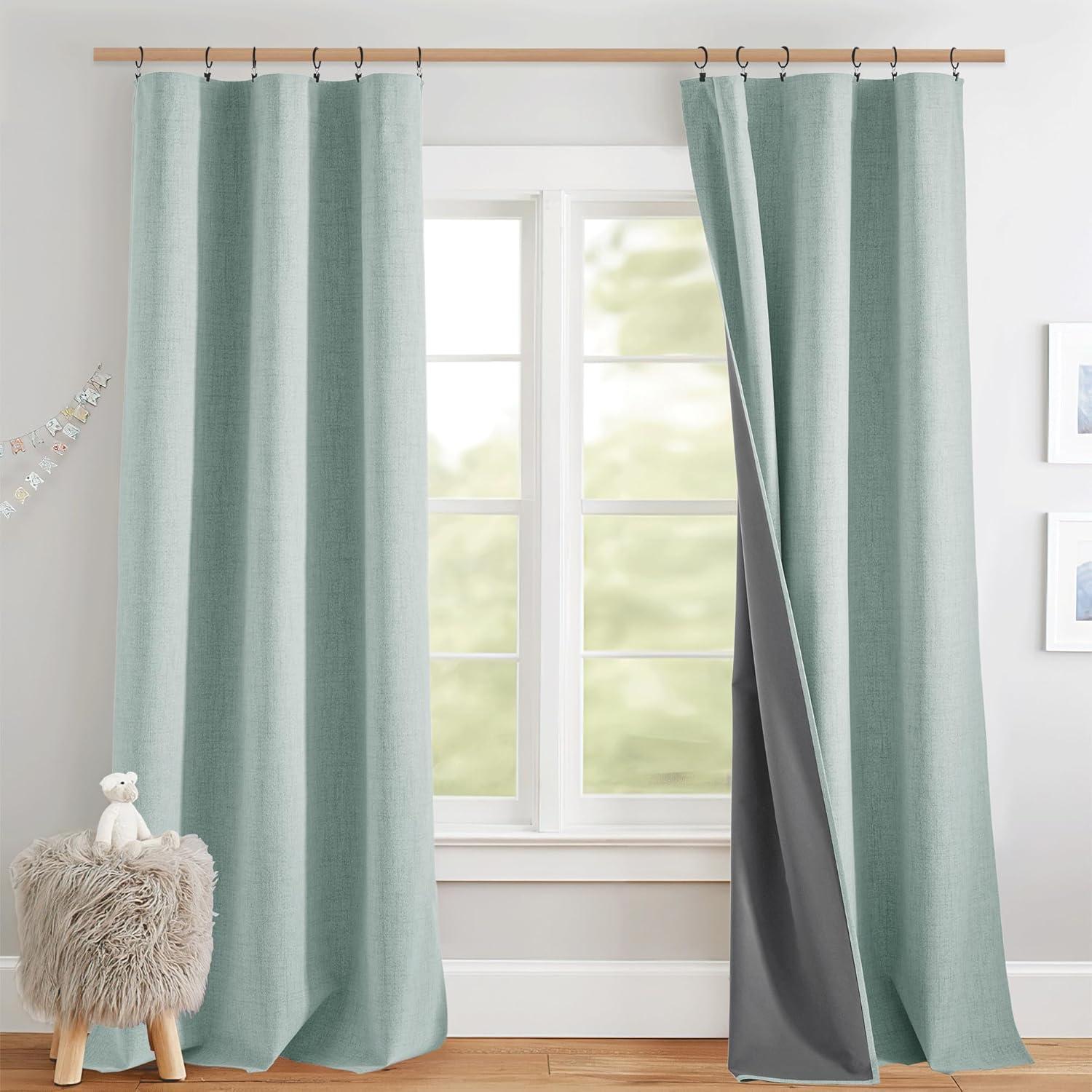 NICETOWN Natural Full Blackout Back Tab Linen Curtains 84″ Long 2 Panels, Boho-Chic Thick Linen Blend Drapes for Bedroom, Thermal Insulated Window Covers with White Backing for Cafe Bar (42″ Wide)(Seafoam Green)