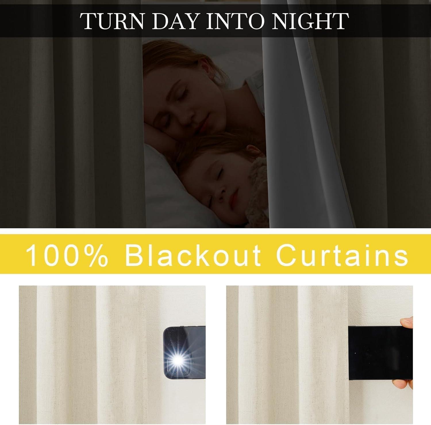 100% Blackout: The faux linen real blackout curtains sewn in white liner backing to keep out the sunlight and UV rays completely. Also offers you a really dark environment, bringing you a good night's sleep during the day.