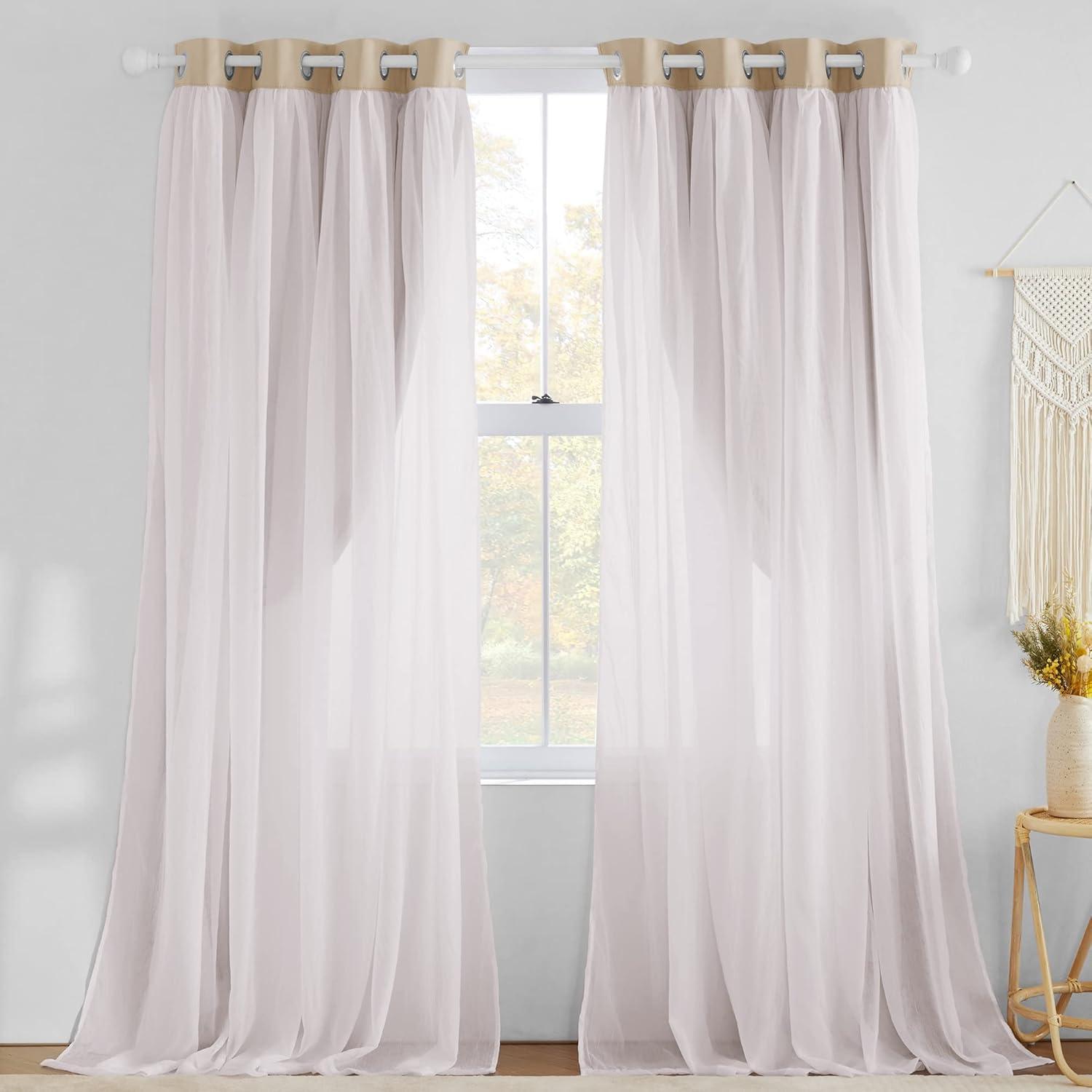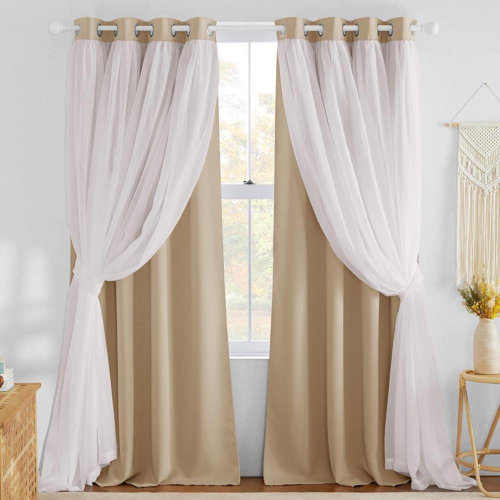 READY MADE: Package includes 2 crushed sheer layers attached over 2 blackout curtain panel. Curtain measures 52″wide per panel. 1.6″ diameter grommet fits various standard or decorative curtain rods.