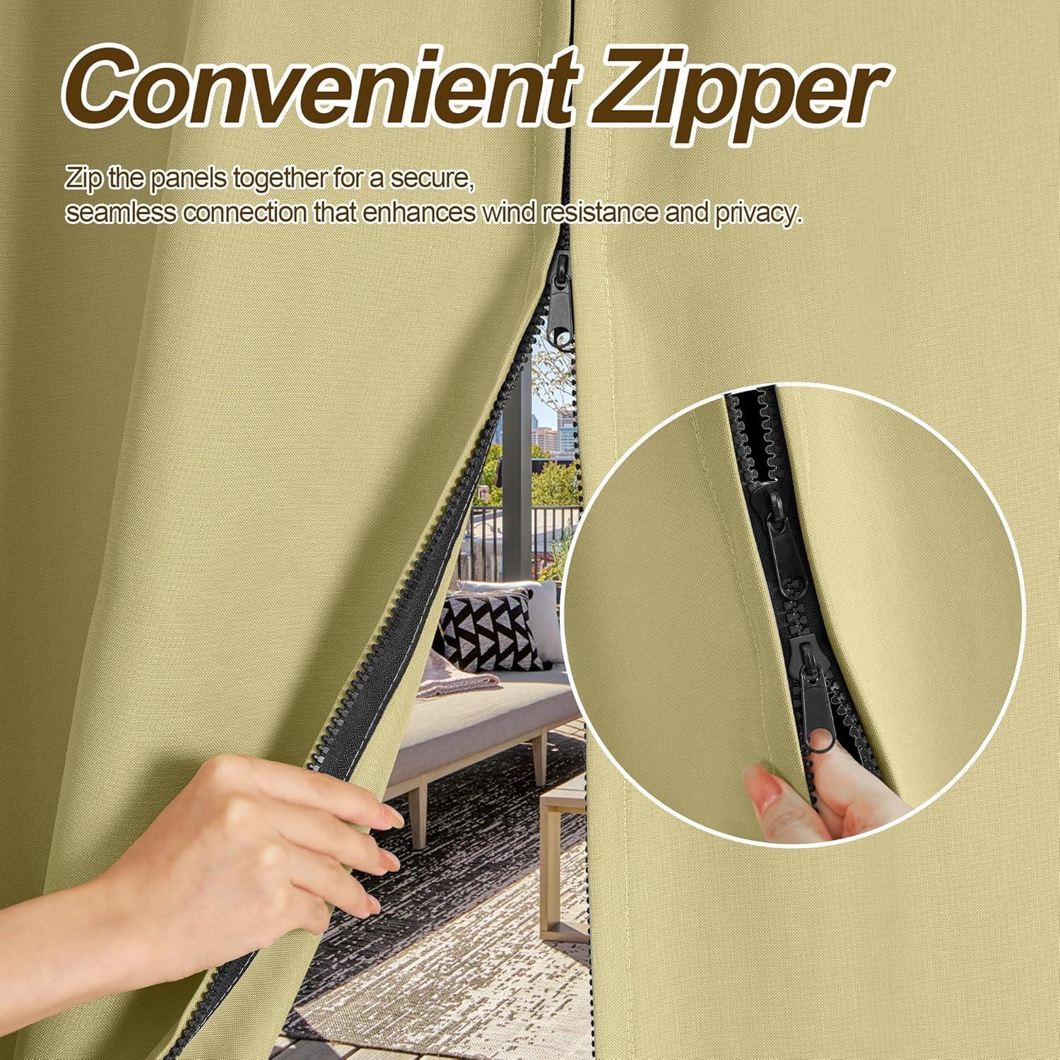 NICETOWN Outdoor Curtains for Patio Waterproof with Zipper Connects 2 Panels, W54 x L108 in, Gazebo Curtains Top Grommet & Bottom Back Tab with Rope, Windproof & Privacy Sun Shades for Porch, Taupe(Buff)