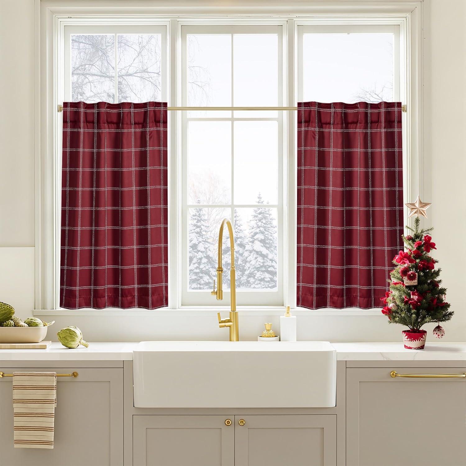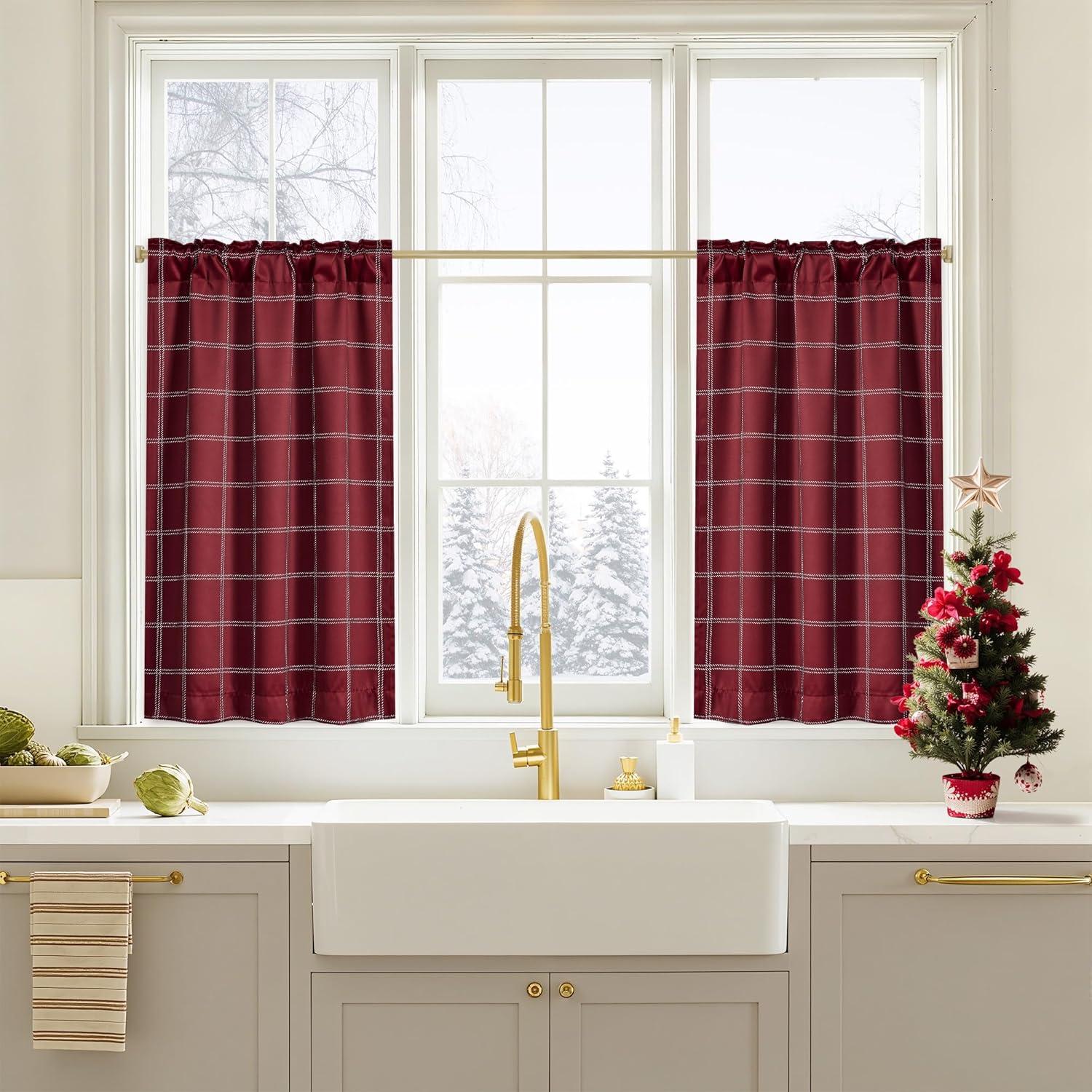NICETOWN Red Christmas Buffalo Plaid Gingham Cafe 100% Blackout Curtains 36 Inch Length, Farmhouse Rustic Checkered Half Window Tier Curtain for Kitchen Bathroom, 26″ W x 36″ L, 2 Panels(Grid Pattern | Red Christmas & White)