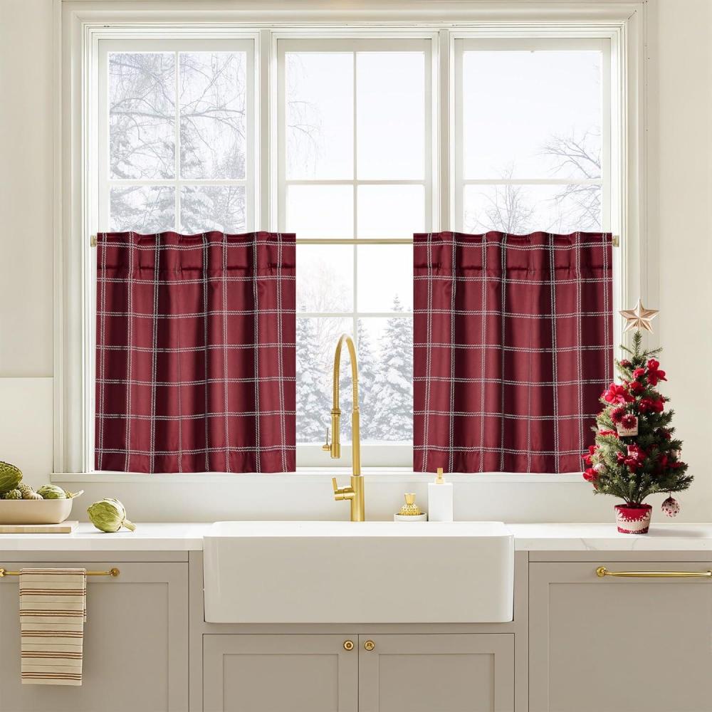NICETOWN Red Christmas Buffalo Plaid Gingham Cafe 100% Blackout Curtains 36 Inch Length, Farmhouse Rustic Checkered Half Window Tier Curtain for Kitchen Bathroom, 26″ W x 36″ L, 2 Panels(Grid Pattern | White & White)