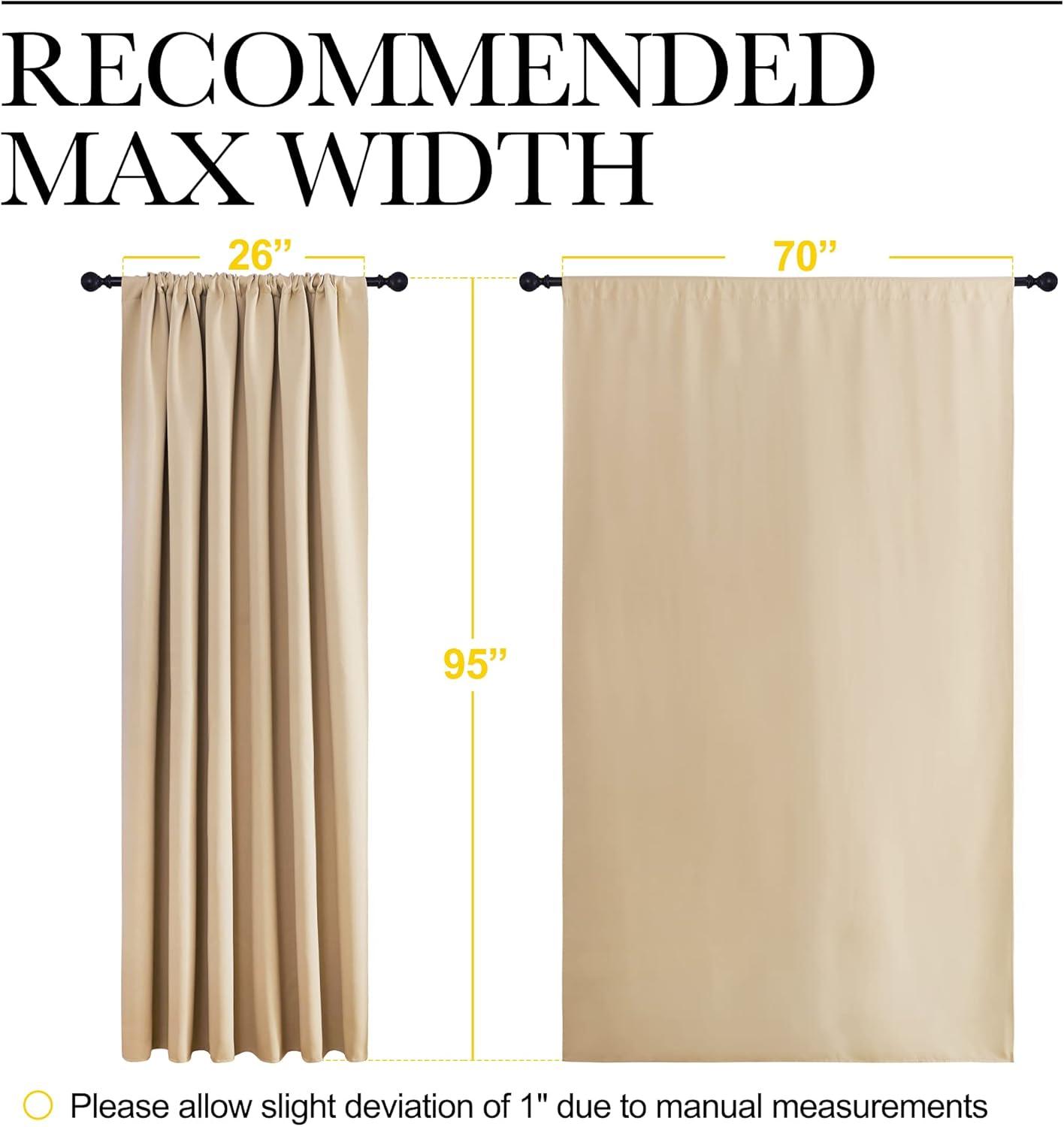 ELEGANT DESIGN: 2 panels per package. Each Blackout Curtain Panel measures 70 inches wide x 95 inches long. The NICETOWN drapery is constructed with rod pocket, fitting the curtain rod of your choice up to 2 inches in diameter, making the curtains easy to install and slide.