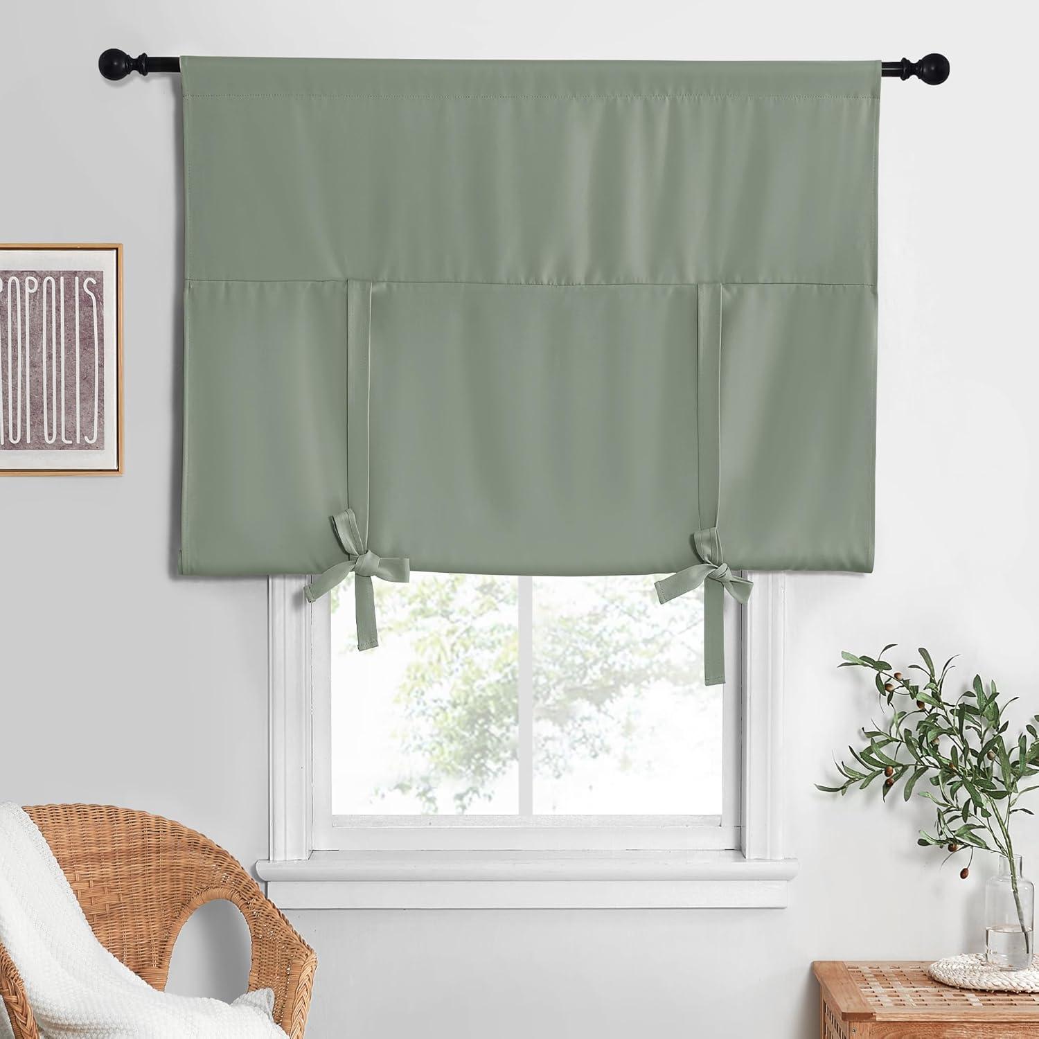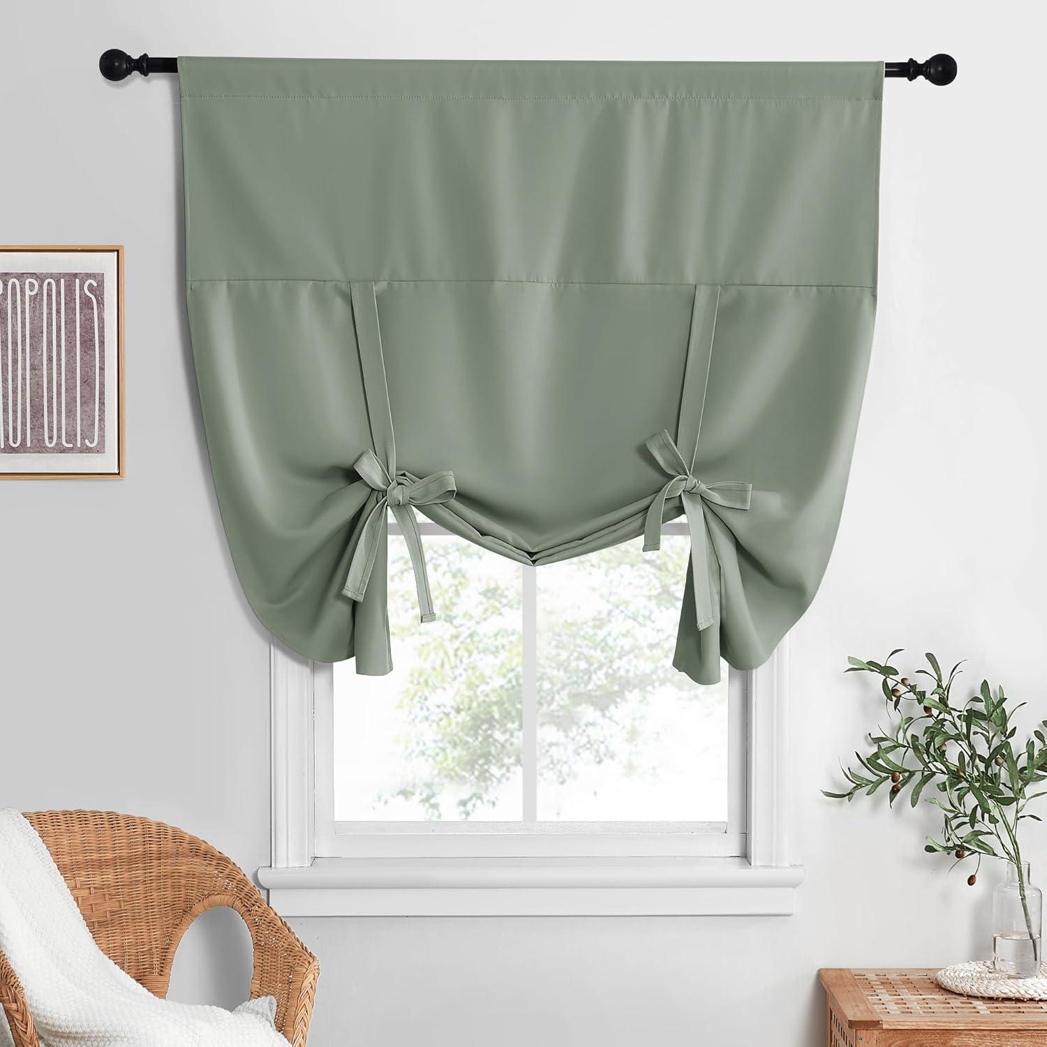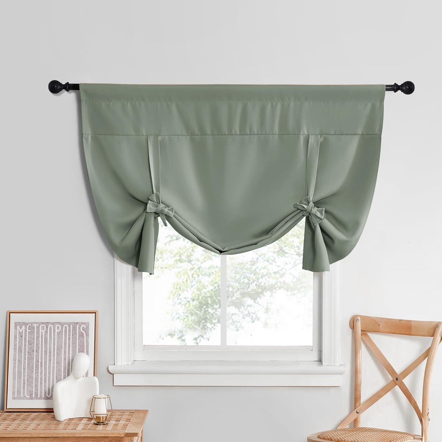 NICETOWN Thermal Insulated Blackout Short Curtain – Bathroom Curtain Gray Tie Up Shade for Small Window, Window Valance Balloon Roman Blind (Rod Pocket Panel, 46 inches W x 63 inches L)(Greyish Green)