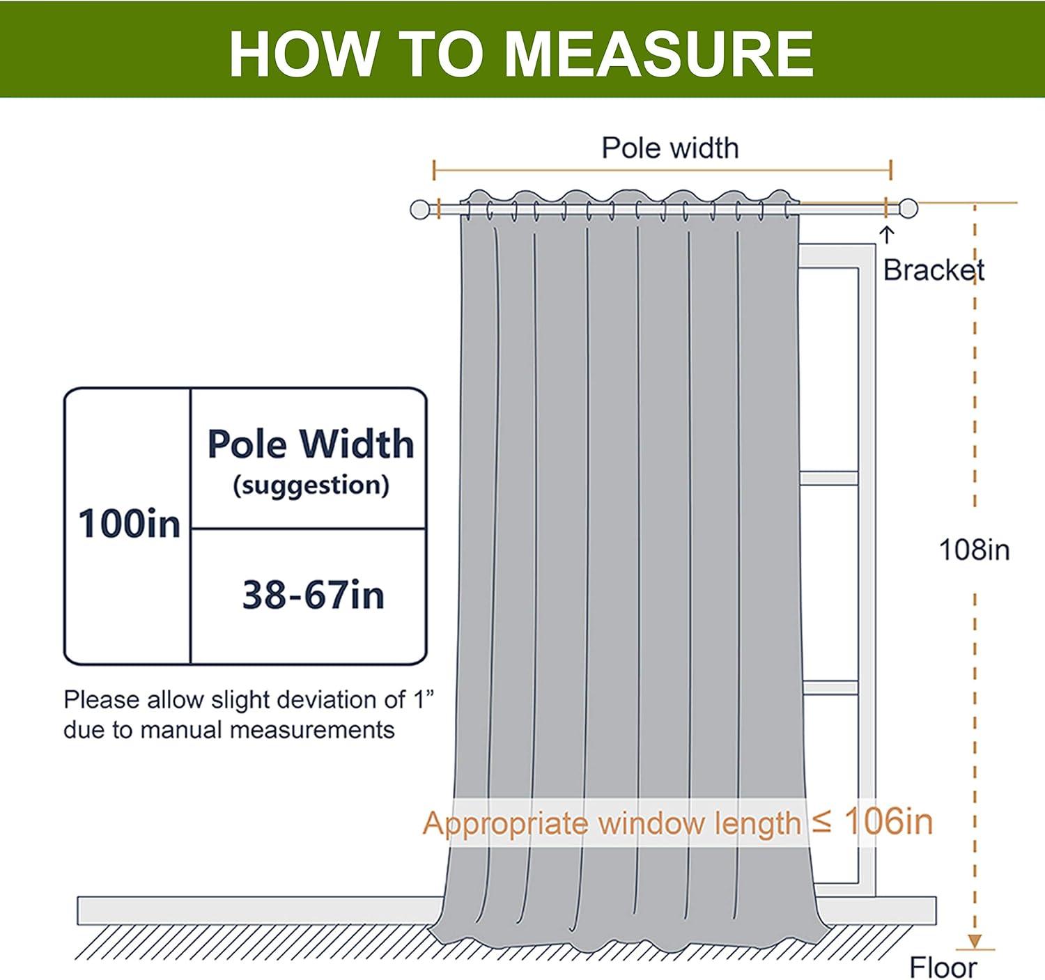 ITEM INFO: Each blackout curtain is W100″ x L108″. Its length is measured from top to the bottom, includes the grommet part. Each of the 14 grommets has a 1.6″ inner diameter, which fits the most rods well. The soft polyester fabric gives you a nice touch. And the length is long enough to touch the floor perfectly.
